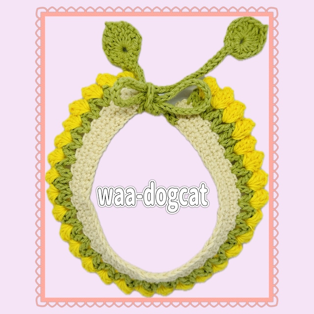 犬用 猫用の首輪(ネックレス)になります‼︎ 全て 手編みで作っています。 ※商品は手作りのため、若干のサイズ誤差が生じる場合がございます。また、写真の写り具合で色合いが多少異なることがありますにで、ご了承下さい。 画像2枚目に記入している首周りサイズですが、紐を強く縛ってのサイズになりますので、 縛り具合によってサイズ調整を行って頂けたらと思います♪ カラー: 本体 黄緑 フリル 黄色 紐 オレンジ 素材: コットン糸