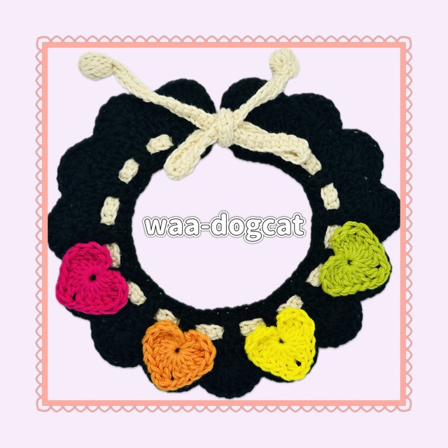 犬用 猫用の首輪(ネックレス)になります‼︎ 全て 手編みで作っています。 ※商品は手作りのため、若干のサイズ誤差が生じる場合がございます。また、写真の写り具合で色合いが多少異なることがありますにで、ご了承下さい。 画像2枚目に記入している首周りサイズですが、紐を強く縛ってのサイズになりますので、 縛り具合によってサイズ調整を行って頂けたらと思います♪ カラー: 本体 黒 ハート 赤,黄,緑,青 紐 ラメ入り 白 素材: コットン糸